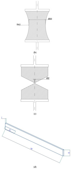 According to the fatigue research methods of rubber materials, different rubber specimens are used, as shown in Figure 3. Figure 3a represents dumbbell-shaped specimens, whose test procedures and geometric shapes are formulated according to ASTM standards and ISO standards, and Figure 3b represents diabolo-shaped specimens, all of which are used for crack initiation tests. Among them, diabolo-shaped specimens are also called dumbbell-shaped cylindrical or hourglass-shaped, and their specific sizes are not uniform because there is no standard for fatigue tests. Diabolo specimens are often used for fatigue research in laboratories because they can be subjected to combined fatigue tests of tension, compression and torsion. In 1940, Cadwell et al. [10] used diabolo specimens for rubber fatigue tests; later, some scholars used this shape of specimen, but the sizes were different. The two most common sizes in the literature were proposed by Beatty [11]. In first one, the curvature radius of the middle part is 42 mm, as shown in Figure 3b, while in the second one it is 2 mm, as shown in Figure 3c. This kind of diabolo specimen can ensure that stress and strain are concentrated in the middle part, so that cracks appear in the middle part. In addition, the middle part in Figure 3c is thinner, and the torque required for applying torsional load is smaller, so it is suitable for fatigue testing with torsion. For the convenience of experiments, diabolo-shaped specimens are usually vulcanized together, with metal plates at both ends during vulcanization. However, this structure also makes it easy to cause cracks or even fractures at the interface between the metal plate and the rubber during the experiment. LeCam et al. [12] explained that this phenomenon is due to cavitation between the metal plate and the rubber specimen. Figure 3d shows the torn specimen used in a crack propagation experiment. Before the experiment, a crack with a specific length is preset on the specimen because this can make the crack propagation proceed along the preset crack and prevent multiple scattered cracks or crack deviation [13]. In fact, the shape of the specimen is very important for rubber fatigue tests because the shape of the specimen appearing in the current standards and literature cannot reflect the multiaxial load of real rubber products when they work.