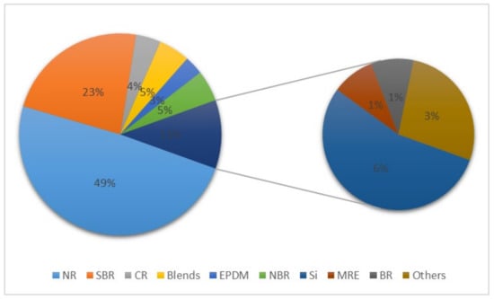 As shown in Figure 4, natural rubber accounts for nearly half of the rubber types studied in recent years. Styrene–butadiene rubber is the most studied synthetic rubber. Different rubbers are widely used in the automobile industry because of their specific properties; for example, hydrogenated nitrile rubber has good oil resistance and heat resistance [65]. Magnetorheological elastomers can be used in shock absorbers, vibration isolators, etc., and have great potential [66].