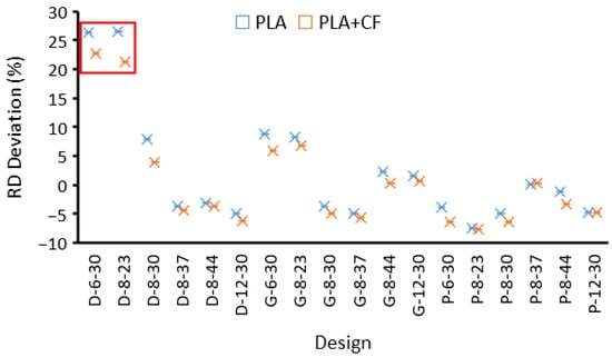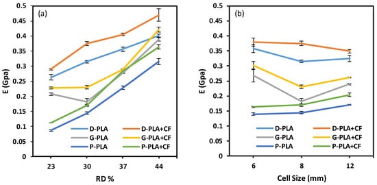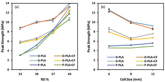 - All structures showed higher compressive modulus for PLA + CF structures compared to the PLA material. However, the peak strength of Gyroid and Primitive designs for PLA + CF lattice structures was lower compared to that of PLA, and this effect became more pronounced at higher RDs.