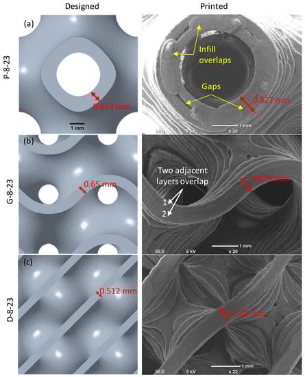 - The measured RDs of the printed lattice structures were found to be in close agreement (max error ±8%) with the designed RD values. However, at a lower RD and smaller cell size, the Diamond topology showed a high deviation (~26%) from the designed RDs due to overlaps and FDM resolution leading to higher wall thickness.