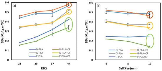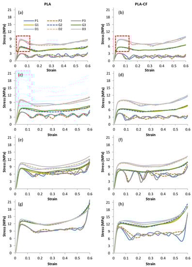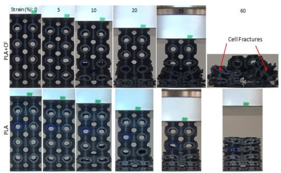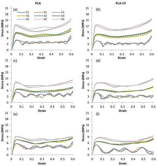 - Compressive strength and energy absorption capacity were both slightly enhanced in most PLA + CF-based Diamond structures. On the contrary, PLA-based Gyroid and primitive structures showed better performance in terms of peak strength and specific energy absorption compared to PLA + CF-based structures.
