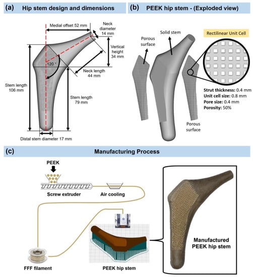 (a) Design and dimensions of the hip stem. (b) Isometric exploded view of the PEEK hip stem. (c) Manufacturing process and 3D printed PEEK hip stem with porous surface rectilinear scaffolds unit cells.