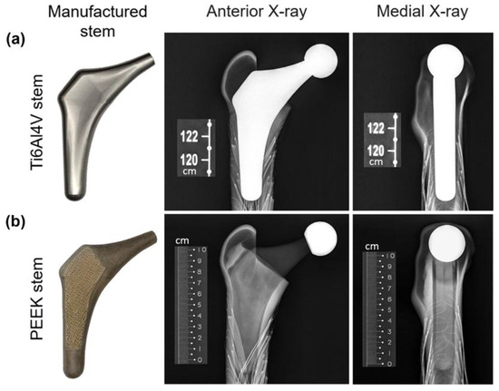 The stress distribution in the femur is largely affected by the mechanical properties of the hip prosthesis. In a composite component, materials with higher stiffness are expected to attract larger stress compared with less stiff materials. Therefore, a large mismatch in stiffness between natural bone and the implant can lead to a severe stress shielding effect [7]. In current THA design, metals, such as cobalt–chromium alloys, 316L stainless steel, and titanium and its alloys (e.g., Ti6Al4V, Ti–Mg), are the predominant materials of choice for femoral stems [8,9,10]. These materials have noticeably high stiffness compared to the femur. For instance, Ti and its alloys are widely applied in THA with the advantages of high biocompatibility and high fatigue strength. Although they have relatively lower Young’s modules (110 GPa) than other metals, it still remains much higher than that of natural bone (1–30 GPa) [11].
