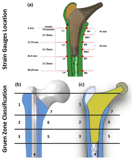 One of the major post-surgery complications is aseptic loosening. It is induced by four mechanisms: mechanical failure of the implant or cement, the introduction of wear debris into the interface region causing osteolysis, relative motion across the interface, and stress shielding in the bone [3,4]. Mutable biological responses can be initiated through these mechanisms, which lead to bone resorption and eventual loosening of the implant. Noticeably, stress shielding is the main cause of aseptic loosening in long-term service, which is commonly revealed in clinical cases [5]. It is caused by insufficient load transfer between bone and the implants. Based on Wolff’s law, bones adapt to the mechanical load they receive, suggesting that when a person is much more active in a particular region of the body, more bone is produced to strengthen the tissue, and when a bone is unloaded for an extended period, the tissue mass can diminish accompanied by bone resorption. In post-surgery conditions, only part of the load is transferred to the bone, while most of the load is carried by the implant [6]. This altered stress profile is expected to cause mineral bone lost in the interface of bone and implants leading to loosening due to the lack of contact in the interface.