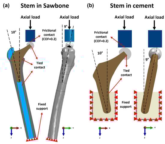 Loading and boundary conditions of the FE model of the Ti6Al4V and PEEK stem fixed in (a) Sawbone and (b) cement.