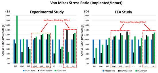 Both experimental testing and FEA are conducted to assess the surface von Mises stress and compressive strain for the three configurations, including the intact femur, the femur implanted with a Ti6Al4V hip stem, and the femur implanted with a PEEK hip stem. The local strain gauge results for experimental and FEA studies are shown in Figure 7a and 7b, respectively. The von Mises stress ratio is defined as the von Mises stress of implanted femur divided by that of intact bone on the same point, which suggests the change in stress in each point of interest after implantation with Ti6Al4V and PEEK stems. From the experimental data, it can be seen that for most sites, the femur with the PEEK stem has a higher stress ratio compared to the femur with the Ti6Al4V stem, which indicates that the femur with the PEEK stem would undergo more load compared to its counterpart in loading condition, and, thus, mitigates the stress shielding effect. As illustrated in Figure 7a,b, strain gauges MX2, M3, M4, L3, and L4 (highlighted with a red dotted box) show that the Ti6Al4V stem has a higher stress ratio than 100% when compared to the intact bone. This suggests that there is no stress shielding effect on these points. These findings align with the results in the literature, which report limited stress shielding in distal regions [53]. For the FEA study, similarly, there is no significant change in stress in MX2, M3, M4, L3, and L4 after implantation of both stems. For other points (M1, MX1, L1, and L2), the stress ratio for the PEEK stem is much higher (by approximately 40%) than that for the Ti6Al4V stem.