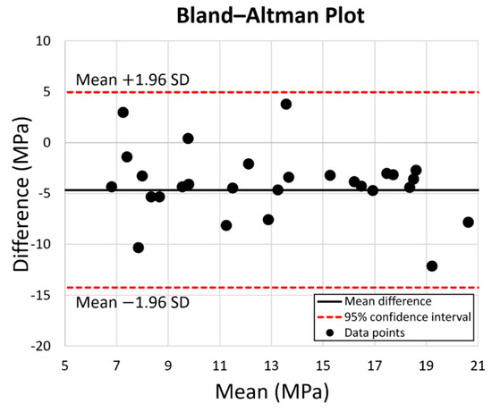 Except for the points which were affected by the gap in the PEEK stem model, experimental and FEA studies exhibited a similar pattern. FEA validation was undertaken by comparing the experimental and FEA results via the Bland–Altman plot. As shown in Figure 8, the dots present the mean and difference (bias) between the von Mises stress obtained by experiment and FEA from each point of interest. Since all the dots are within the 95% confidence interval, a good agreement between the experimental test and FEA study is confirmed; thus, the validation of the FE model of the intact femur is proved.