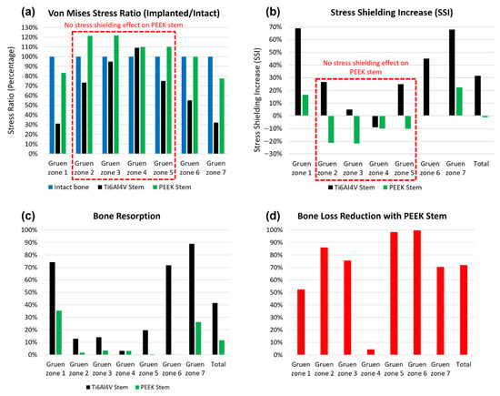 As shown in Figure 10a, the von Mises stress ratio of the PEEK stem has less than 21% of the difference from that of intact in all Gruen zones, which indicates that a femur with the PEEK stem has a relatively natural stress distribution. There is no stress shielding effect on the PEEK stem in Gruen zone 1 to 4 since the SSI value in these zones is below 0%. The SSI value in Gruen zone 4 for both Ti6Al4V and PEEK stems is negative, which suggests that no stress shielding showed in this region even with generic Ti6Al4V stem. This finding corresponds to previous research on a porous Ti femoral stem [27].