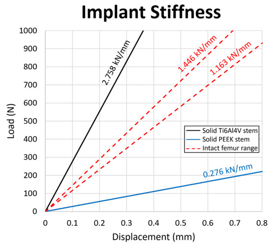To ensure a sufficient and safe lifespan and reduce the rate of revision surgeries, the mechanical properties of the PEEK stem should be carefully evaluated. In this study, compression tests are conducted for both PEEK and Ti6Al4V stems to examine the stiffness of the stems. Figure 11 shows the load–displacement chart and stiffness line of the Ti6Al4V stem, PEEK stem and human intact femur range [55]. The Ti6Al4V stem has a higher stiffness at 2.758 kN/mm as the intact femur at 1.446 and 1.163 kN/mm for males and females, respectively. Reversely, a relatively low stiffness at 0.276 kN/mm is obtained for the PEEK stem, which is below the range of stiffness for the intact femur.