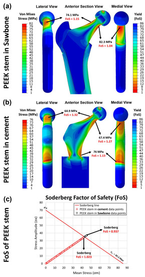 In service conditions, the implanted stem should undergo cycling loads due to the daily activities of the patient. Hence, the study on the fatigue life of the PEEK stem is of significance. To numerically analyze the fatigue factor of safety of the proposed stem, Soderberg fatigue theory, which is considered to be an accurate and conservative approach for medical research [51], is used. Stress ratio (R) = 0.1, with the minimum stress collected at 230 N and maximum stress collected at 2300 N in one loading cycle, is applied in this case. The mean stress and alternating stress are measured using Equations (8) and (9) respectively.