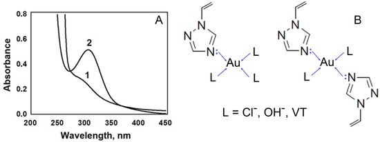 The radiation-induced polymerization of VT in the presence of Au(III) ions was studied at initial ratios of the monomer and Au(III) ions of 40/1, 80/1, 160/1 and 320/1. The samples prepared in these ratios are either transparent (80/1, 160/1, 320/1) or slightly opalescent solutions (40/1) and do not precipitate during irradiation. Meanwhile, an increase in the Au(III) concentration to the ratio of 20/1 leads to the gradual precipitation of the Au–VT complex, which greatly complicates kinetics investigations. Significantly, when mixing aqueous solutions of VT and HAuCl4 (the resulting pH is 2.5–3.0), a distinct band with the maximum at 310 nm (Figure 1A), corresponding to electronic transitions from occupied Cl− ligand orbitals to unoccupied metal orbitals [29], practically disappears. The same effect was observed earlier for PVT-HAuCl4 aqueous solutions [27], and it clearly indicates the replacement of chlorine ions in the chloride complex by the triazole groups. The schematic representation of the proposed structures of the VT–Au(III) complexes is shown in Figure 1B. Depending on pH and the VT/Au(III) ratio, L could be either a low molecular weight ligand Cl−, OH− or another VT molecule [27,29].