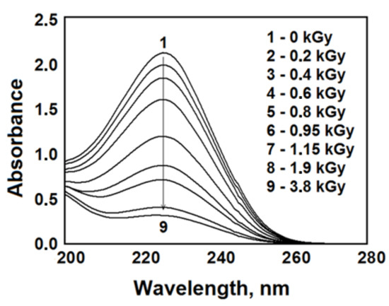 All experiments were carried out in a slightly acidic medium at an initial pH value of 5.6 (±0.2), which ensures the generation of reducing species with high yields [16,20] and prevents the hydrolysis of Au(III) ions [29]. Such conditions proved to be favorable both for the reduction in metal ions (Au(III), Ag+, Cu2+) in the presence of PVT and for the stabilization of nanoparticles by macromolecules [15,16,24,26,27].