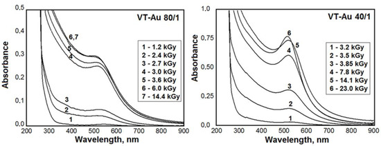The results obtained show that irradiation of the samples leads to a decrease in the absorption band with the maximum at 226 nm, which is assigned to the double bond (C=C) of the VT molecules [15,16] (Figure 2). The total absorbed doses corresponding to the complete conversion of VT into PVT are 5–7 kGy for samples prepared at the ratios of 40/1, 80/1 and 160/1. In the case of solutions with the lowest concentration of Au(III) (320/1), polymerization is virtually completed at a dose of 2–3 kGy. Simultaneously, initially colorless samples become either red (40/1 and 80/1) or brownish red (160/1), which qualitatively indicates the formation of AuNPs [3,27]. At the ratio of 320/1, the Au(III) concentration is too low; therefore, irradiation was not accompanied by a pronounced change in the color of the samples. The UV-Vis spectra of the irradiated samples are shown in Figure 3. The broad absorption bands at ca. 520 nm corresponding to the surface plasmon resonance (SPR) of AuNPs [3,27] rise when increasing the dose due to gradual conversion of Au(III) ions into AuNPs, up to doses of 5–10 and 15–20 kGy for samples with the ratios of 80/1 and 40/1, respectively. The “blue shift” of the position of the SPR bands maximum to the UV region seems to be associated with an increase in the electron density in the metal due to the reduction in Au ions adsorbed on the AuNPs surface [30].