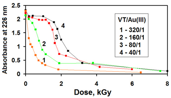 Active species, generated in aqueous solutions of VT containing metal ions during irradiation, promote both the polymerization of a monomer and the formation of nanoparticles [16,17,19,20]. In this regard, the understanding of the mechanisms of the radiation-induced assembling of metal polymer nanocomposites is the key problem. The present work is mainly focused on the kinetic investigation of simultaneous VT polymerization and radiation chemical synthesis of AuNPs in one reactor, with specific attention being paid to the effect of the concentration of Au(III) ions on the efficiency of VT polymerization.