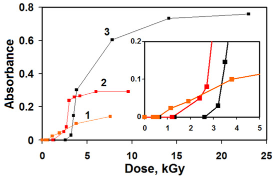 The dose-dependences of the optical density of the LSPR bands of AuNPs of the irradiated VT–Au(III) solutions with various ratios of VT to Au(III): 160/1 (1), 80/1 (2), 40/1 (3).