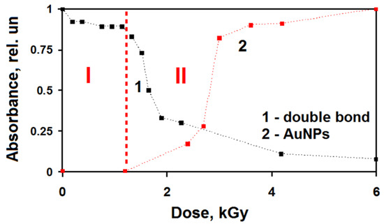 Another important point in kinetic studies is concerned with the development of the absorption band at ca. 520 nm during irradiation. The data presented in Figure 7 clearly demonstrate that a long induction period is followed by an accelerated formation of AuNPs. Furthermore, the induction dose rises when increasing the Au(III) concentration. Significantly, the absorbed doses, corresponding to the onset of rapid polymerization, correlate with the doses at which the accelerated formation of AuNPs begins (Table 2). Thereby, along with the sigmoidal (S-shaped) kinetics of nanoparticle growth [34,35], an “S-reverse” kinetics of the monomer consumption takes place (Figure 8).