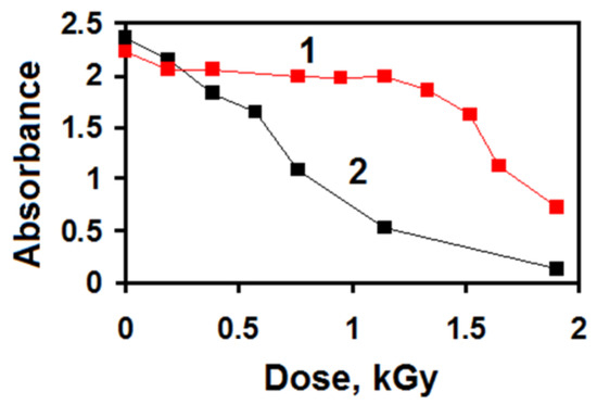 The dose-dependences of the optical density at λ = 226 of the irradiated VT–Au(III) (the (VT)/(Au(III)) ratio is 80/1) with (1) and without (2) ethanol (diluted by a factor of 50).
