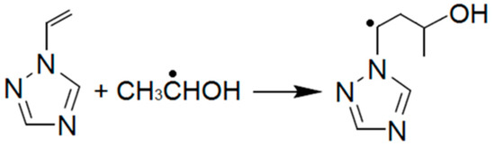 The hydrated electrons and ·OH radicals formed in the highest yields possess respectively strong reducing (E0 = −2.9 VNHE [33]) and oxidizing properties (E0 = 1.9 VNHE [33]). Thus, if the former species acts as the main reducing agent for metal ions [20,21], then the latter can oxidize isolated metal atoms and ions in intermediate valences [20,21]. In order to provide favorable conditions for the formation of metal nanoparticles, the ·OH radicals should be scavenged, for instance, with aliphatic alcohols [16,20]. However, at the same time, the ·OH radical acts as an initiator of radical polymerization [16,17]. In our recent work, we established that the presence of ethanol (10 vol.%) has no noticeable effect on the radiation chemical yield of the loss of the monomer upon irradiation of 1 and 10 wt. % VT aqueous solutions [16]. This fact indicates a comparable efficiency of chain initiation by both ·OH and alcohol radicals formed by the reactions (2, 3):