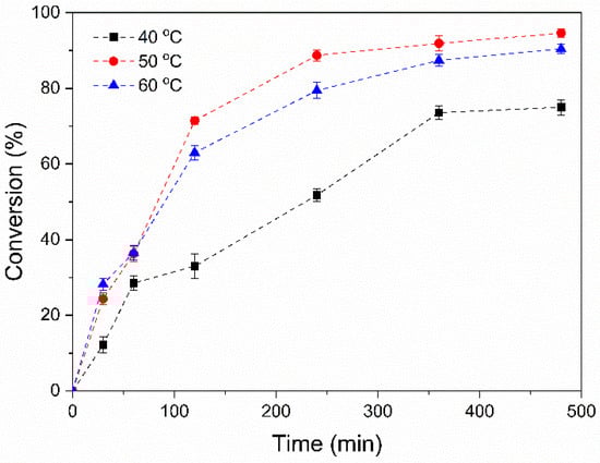 The effect of the reaction temperature on the preparation of the modified DPNR particles was studied. The experiment was performed by using 10 phr of monomer content and 1 phr of the initiator. Figure 2 presents a plot of the monomer conversion as a function of polymerization time at different reaction temperatures (40, 50, and 60 °C). It can be seen that the conversion increased with increasing polymerization time for all temperatures used. The polymerization rate increased rapidly at the initial polymerization stage and remained constant after 360 min. When the reaction temperature increased from 40 to 50 °C, the conversion increased from 73.6 to 91.9%. The increase in temperature can cause a higher collision frequency between monomer molecules and the free radicals in the system. This resulted in an acceleration of the polymerization rate and an increase in monomer conversion []. However, after increasing the temperature to 60 °C, the monomer conversion slightly increased at the early stage of polymerization, and then the conversion seemed to decrease when compared to 50 °C. The monomer conversion was reached at 87.4%. Thus, the reaction temperature at 50 °C, which exhibited the highest conversion, was selected for further study.