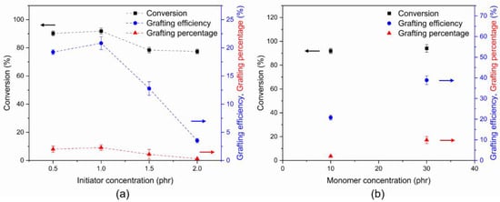 (a) Effect of initiator contents; (b) effect of monomer contents on the monomer conversion, grafting efficiency and grafting percentage.