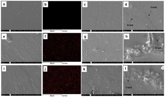 The morphology of the silica-filled DPNR, silica-filled P10-DPNR, and silica-filled P30-DPNR composites, with varying silica content, was examined by scanning electron microscope, as demonstrated in Figure 11, Figure 12 and Figure 13, respectively. The cross-section surface of all vulcanizates (by freeze fracturing with nitrogen liquid) showed a smooth surface with some compounding ingredients appearing on their surfaces. When the silica was added into the system, good distribution of the silica particles in the natural rubber matrix was obtained for the composites with 10 phr of silica, as observed from the SEM/EDS mapping. However, some aggregation of the silica particles was observed under high-loading content (20 phr). The samples were then subjected to tensile tests, and the fracture surface was examined by SEM. The tensile fracture surface of the DPNR was smooth, as shown in Figure 11c,d. We observed holes and small cracks throughout its surface. This is because the compounding ingredients are pulled out from the tensile force, which was attributed to poor adhesion with the natural rubber matrix []. For the P10-DPNR in Figure 12c,d and the P30-DPNR in Figure 13c,d, the embedment of the compounding ingredients into the surface was observed. The morphology clearly changed after tensile measuring, leading to a rough surface. The modification of natural rubber by PAA-co-PAM grafting strongly affects its fracture morphology, indicating the rigid structure of the modified rubber []. For the DPNR with the addition of silica at 10 phr in Figure 11g,h and 20 phr in Figure 11k,l, cracks in the rubber matrix at the region between the natural rubber and the silica cluster were found due to the weak interaction and incompatibility of both of the components. In the case of the silica-loaded (PAA-co-PAM)-DPNR samples, uneven microscopic layers and rough surfaces were observed. The SEM images in Figure 12 and Figure 13g,h,k,l clearly revealed the extended region of the NR matrix-silica clusters after deformation []. Therefore, the grafting of DPNR with polar components might improve the interaction between natural rubber and fillers. This overall remarkable morphology change was due to the strong interfacial adhesion between the modified DPNR and the silica.