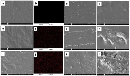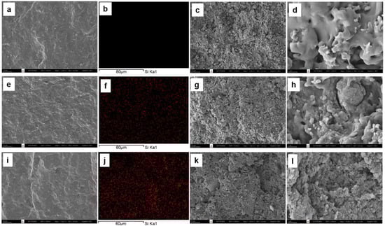 SEM images of freeze fracturing, corresponding EDS (the red spots indicate silica particles), and tensile fracture surface at ×1000 and ×10,000 magnifications of (a–d) DPNR; (e–h) DPNR-10Si; (i–l) DPNR-20Si.
