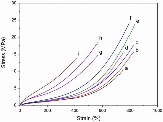 The dried samples (1.0 cm × 1.0 cm × 0.2 cm) were immersed in toluene for 24 h. Then, the samples were collected and weighed after wiping them with filter paper. The swelling ratio was calculated using the equation here.