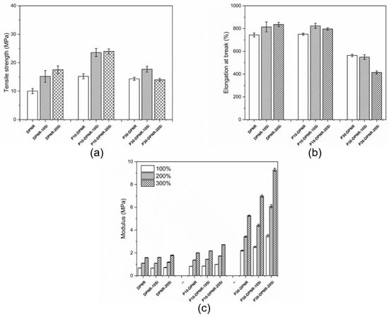 The natural rubber compounds mixed with different concentrations of silica were prepared by using a two-roll mill. The optimal temperature and time for vulcanization were determined by a moving die rheometer (MDR). The cure characteristics of all the compounds obtained from the MDR at a vulcanizing temperature of 150 °C are shown in Table 4. For the compounds without silica, the (PAA-co-PAM)-DPNR compounds exhibited a shorter scorch time and longer cure time when compared to the DPNR compound. In this case, the DPNR was functionalized with a copolymer consisting of carboxylic acid and amide groups. These additional groups may affect the vulcanization process. The vulcanization reaction was accelerated by the presence of amine-containing substances, resulting in a decrease in scorch time []. On the other hand, vulcanization retardation occurred, which might have increased the vulcanization time, as is seen in the case of existing methacrylic acid in rubber composites []. After that, the silica-filled rubber composites were prepared by mixing them with different concentrations of silica at 10 and 20 phr. Generally, silica contributes to the vulcanization system by delaying the rate of vulcanization []. Considering the chemical structure of silica, it possesses silanol groups that can adsorb the accelerators in the system, resulting in higher scorch times and cure times []. In the case of silica-filled DPNR, it was clearly observed that the scorch time and cure time of DPNR-10Si and DPNR-20Si were higher than that of the DPNR compound without silica, and, consequently, the cure rate index decreased. However, the (PAA-co-PAM)-DPNR with 10 and 20 phr of silica showed an increase in the cure rate, with shorter scorch and cure times when compared to silica-filled DPNR using the same amount of silica. It could be that the polar functional groups contained in the modified DPNR play an important role by interacting with silica in the mixing step. Therefore, the adsorption of the accelerators was reduced, resulting in an increase in the cure rate. The presence of (PAA-co-PAM) and silica in the rubber compounds revealed important features. At 10 phr of silica loaded into the (PAA-co-PAM)-DPNR compounds, a longer scorch time and shorter cure time were observed when compared to the (PAA-co-PAM)-DPNR without silica. For the processing, the longer scorch time enhances processing safety, while a shorter cure time is preferred in terms of better productivity []. When the silica content was increased to 20 phr, the scorch time and cure time increased for the modified rubber compounds using 10 phr of silica. Although some silica interacted with the modified DPNR, more of the free silica from the higher loadings had the ability to adsorb the accelerators, leading to the retardation of the vulcanization process. In addition, the minimum torque (ML) of the (PAA-co-PAM)-DPNR was higher than that of the DPNR. It was also found that the ML increased with an increase in silica content in the compounds. The ML is related to the viscosity of the rubber compounds. The increase in ML was probably due to the PAA-co-PAM chains and the rigid silica particles restricting the motion of the rubber chains []. Moreover, the delta torque (MH-ML) of the (PAA-co-PAM)-DPNR was higher than that of the DPNR, and the addition of silica presented an increase in the delta torque. The delta torque was related to the crosslinking density of the vulcanizates. These results corresponded with the swelling tests of the rubber composites in toluene, as shown in Figure 9. The high crosslinking density of the rubber vulcanizates leads to a reduction in the swelling degree []. It was observed that the DPNR had a swelling ratio of 4.12. The swelling ratio decreased to 3.73 and 2.18 for P10-DPNR and P30-DPNR, respectively. At the same time, the swelling ratio tended to decrease with an increase in silica content, which was clearly observed in the case of the silica-filled (PAA-co-PAM)-DPNR composites. For example, the swelling ratio values were found to be 3.73, 3.57, and 3.20 for the P10-DPNR mixed with 0, 10, and 20 phr, respectively. The grafting of (PAA-co-PAM) onto the DPNR, together with the addition of silica, exhibited a noticeable increase in the delta torque and a decrease in the swelling ratio, indicating the high crosslink density in the structure. Their interactions are illustrated in Figure 10. The increase in crosslink density is probably due to the crosslinking reaction via sulfur vulcanization, together with the hydrogen bonding of the (PAA-co-PAM) copolymer chains and the interaction between the grafted polar functional groups and the silica [].
