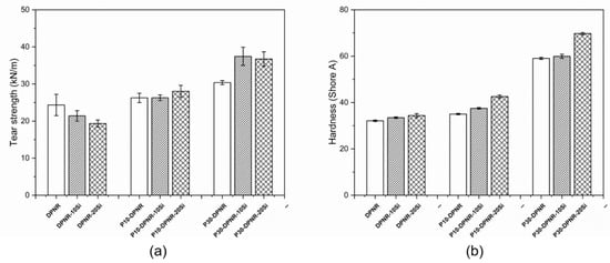 The specimens for tensile measurement were prepared by cutting them into a dumbbell shape according to ASTM D412 []. For tear measurement, the specimens were followed by ASTM D624 []. The measurement was performed using the universal testing machine 5569 (Instron, Norwood, MA, USA) under the condition of crosshead speed of 500 mm/min with a 10 kN load cell. The measurement was repeated six times for each sample. The ability of the samples to resist deformation by hardness was also determined. The hardness measurement was carried out by HPE Shore A durometer (Bareiss, Oberdischingen, Germany). The samples were measured according to ASTM D2240 []. A steel pin was pressed into the rubber surface. The hardness value was recorded.