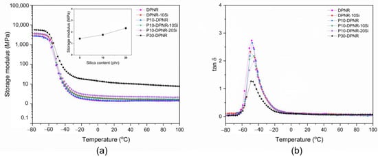 (a) Storage modulus: inset; storage modulus of silica-filled P10-DPNR as a function of silica content; (b) loss tangent (tan δ) of silica-filled natural rubber composites as a function of temperature.