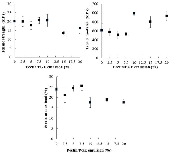 Regarding Young’s modulus of the films, it was not affected by Pectin/PGE addition until addition of 10% was reached, i.e., the films became stiffer with an addition ≥10% of Pectin/PGE. The strain at the maximum load also showed a significant decrease at Pectin/PGE loadings ≥10%.