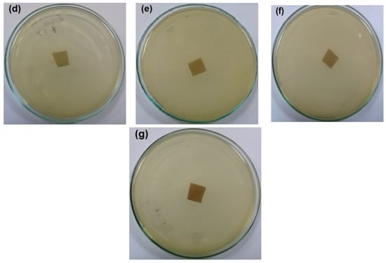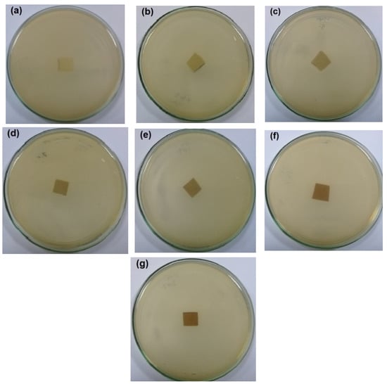 Images of the antibacterial test of CNFs/Pectin/PGE films against S. aureus: (a) blank CNFs, (b) CNFs + 2.5% Pectin/PGE, (c) CNFs + 5% Pectin/PGE, (d) CNFs + 7.5% Pectin/PGE, (e) CNFs + 10% Pectin/PGE, (f) CNFs + 10% Pectin PGE, and (g) CNFs + 20% Pectin/PGE.