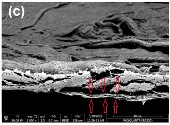 The well-known unique properties of CNFs such as the high specific surface area, the nanometer wide and micrometer length dimensions, the combination of unique intrinsic mechanical strength with good flexibility properties, and the ability of strong hydrogen bonding along the nanofibers or with other different matrices motivate their application in different areas including papermaking. CNFs can improve mechanical, barrier (air, moisture, oil, and thermal), and printability properties, and reduce paper weight products [21,22,23,24,25,26,27,28]. Nevertheless, due to the negative effect of CNFs on the drainage of water during paper sheet formation as a result of their very small size, very high water holding capacity, and ability to fill empty spaces between the pulp fibers and clog pores of the wet web [27,29,30], applying CNFs as a surface coating after paper sheet formation instead of applying them as a paper additive has resulted in increasing interest for improving paper properties and the production of novel paper products [31,32,33,34,35,36,37,38]. Usually, paper coating materials are used in very small quantities and applied as a very thin layer, yet they bring about significant effects on paper properties. Specifically, CNFs isolated from SBP were successfully used as a coating material for paper sheets to improve mechanical and oil-proof properties, as well as air permeation resistance [31].