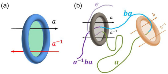 (a) In the superspace approach of ring-shaped obstacles, the subspaces can be connected with a ‘portal gate’, which is actually the circular plane (green) of the ring. Crossing the gate from left to right, in this example, corresponds to a generator of the -generator free group, which is also a group element of this group. (b) A typical example of the entangling mode corresponding to the group element . Note that the light-purple chain segment is in the identity subspace , the green chain segment is in the subspace , the light-blue is in , and the purple is in .