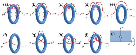 In evaluating the probability of the free end of an ideal chain being found in the subspace , denoted by , we explore nine possible subspaces or nine entangling modes (a–i). Note that another end of the chain is fixed at point in the subspace with the identity element of the infinite cyclic group. (j) Illustration of the coordinate employed in this work. The blue circle represents the cross-section of the ring. The axis z is the central axis of the ring.