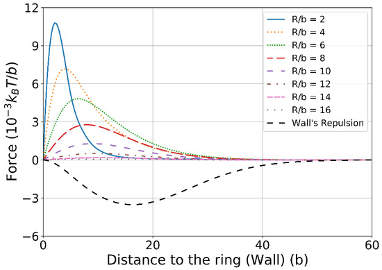 The entropic force felt by the chain when dragging one end of the chain away from the ring (solid lines) or the wall (dash line). Here, we set the force pointing in direction towards the ring or the wall as positive. In the legend, R denotes the ring‘s overall radius.