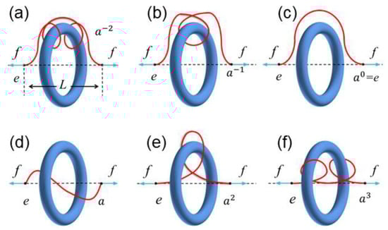 A detailed definition of this superspace is referred to in ref. [17]. Here, we present an example of a chain entangled with two rings to demonstrate the relationship between the topological constraints and the n-generator free group. When the rings are presented, the space suddenly becomes different for the polymer chain. Each ring’s circular plane (green patch in Figure 1a) can be seen as a ‘portal gate’ connecting two different subspaces of the superspace. If the chain segment is now in the subspace with an element of the group, then it will enter the subspace as it crosses the gate from left to right and it will enter from right to left. For the two-ring case (Figure 1b), there will be two portal gates corresponding to the two generators of the free group . In this special example, the light-purple chain segment is in the subspace with the identity element of the group, another end segment (purple) is in the subspace , and, therefore, the entangling mode of this chain conformation with respect to the rings is . Note that these two generators do not commute (e.g., ). For simplicity, this work only considers a one-toroid case, and the free group of the superspace of the one-toroid topological constraint is isomorphic to the group of integers or isomorphic to the infinite cyclic group with group elements