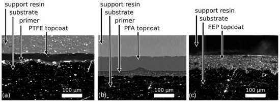 Sectional view of the coating: (a) TF-851 E PTFE, (b) TF-76521 PFA, and (c) TF-3531 FEP.