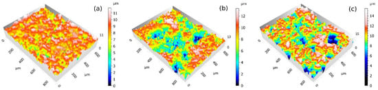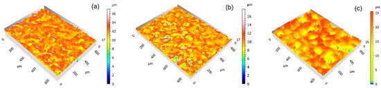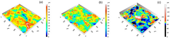 3D topographic captures (×20 confocal lens, Leica DCM8 high-definition microscope) of the coatings after projection of 4 s with plastic particles at 0.4 MPa: (a) PFA, (b) FEP, and (c) PTFE.