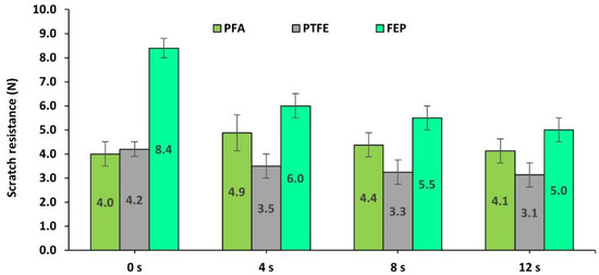 Evolution of the scratch resistance (N) shown by PFA-, PTFE-, and FEP-based fluoropolymeric coatings after 0, 4, 8, and 12 s wear processes via the projection of glass microspheres at 0.4 MPa.