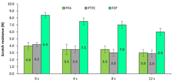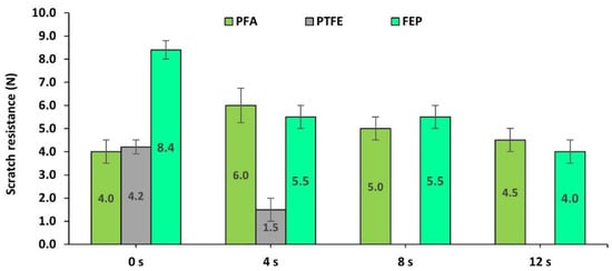 Scratch resistance (N) of the coatings based on PFA, PTFE, and FEP, after 0, 4, 8, and 12 s subjected to the projection of brown corundum particles at 0.4 MPa.