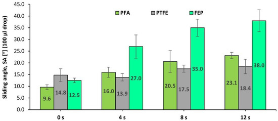 Evolution of the sliding angle (SA) of PFA-, PTFE-, and FEP-based fluoropolymeric coatings after 0, 4, 8, and 12 s wear processes via the projection of glass microspheres at 0.4 MPa.