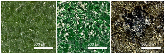 2D images of the coatings after wear process of 4 s by the projection of plastic-polymer at 0.4 MPa, obtained with Leica DVM6 confocal microscope: (a) PFA, (b) FEP, and (c) PTFE.