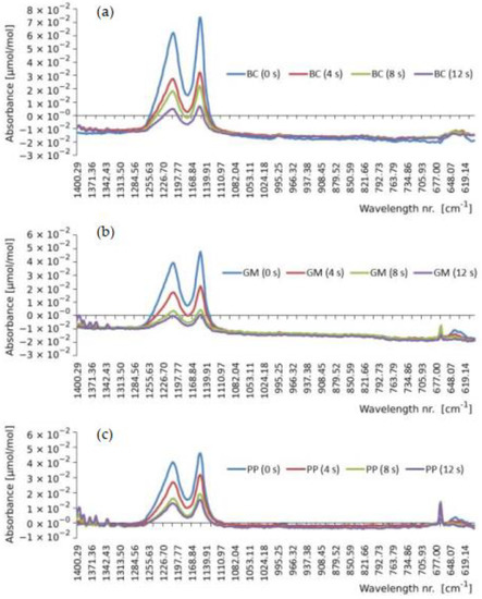 The wavelength values of 1209 cm−1 and 1153 cm−1 appear in the literature as relatively high absorbance “peaks” corresponding to the C-F bonds characteristic of fully fluorinated fluoropolymers. On the other hand, although weaker, there is a peak at a wavelength value of 994 cm−1, which is associated with the C-O-C vibrations of perfluoro alkoxy vinyl ether, i.e., PFA [31]. On the other hand, the variation of absorbance generated by the action of each type of abrasive projected at 0.4 MPa for 0 s, 4 s, 8 s, and 12 s against the PFA coating has been analyzed. Thus, it has been observed that the absorbance intensity values are consistent with the wear tests, as they decrease as the polymer layer decreases due to layer loss and likely due to the interaction with the abrasive.