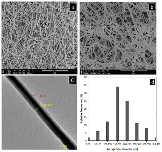 (a,b) SEM images of PLLA@CS coaxial nanofibers; (c) TEM images of PLLA@CS coaxial nanofibers; and (d) diameter distribution of PLLA@CS coaxial nanofibers;.