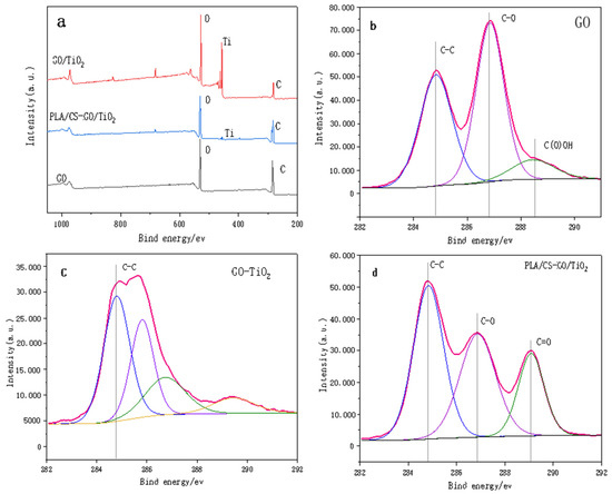 (a) Survey XPS spectra of GO, GO and PLLA/CS–GO/TiO2. High-resolution C 1s XPS spectra of (b) GO, (c) GO/TiO2 and (d) PLLA/CS–GO/TiO2.