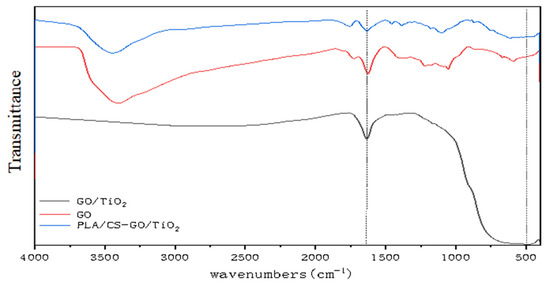FTIR spectra of GO, GO/TiO2, and PLLA/CS–GO/TiO2.