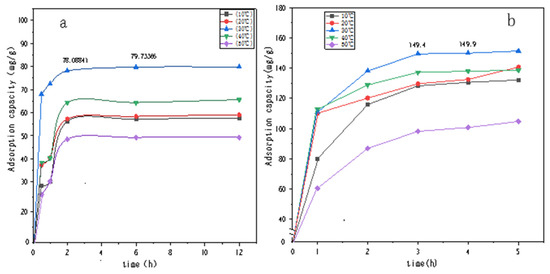 Effect that temperature and adsorption time have on the adsorption of (a) MO and (b) CR dye solutions by PLLA/CS–GO. mg/g refers to the mass (mg) of pollutants removed by the fiber composite material per unit mass (g).