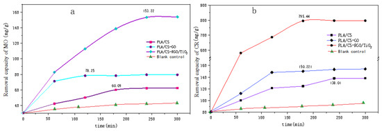 Removal capacity of (a) MO and (b) CR by PLLA/CS, PLLA/CS–GO, and PLLA/CS–GO/TiO2. mg/g refers to the mass (mg) of pollutants removed by the fiber composite material per unit mass (g).