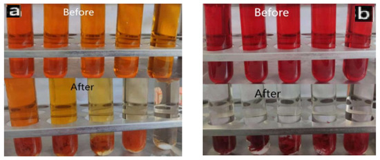 Color changes of MO (a) and CR (b) dye solutions before and after fiber photocatalysis.